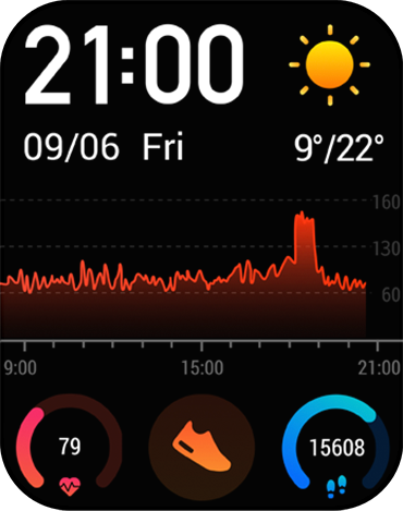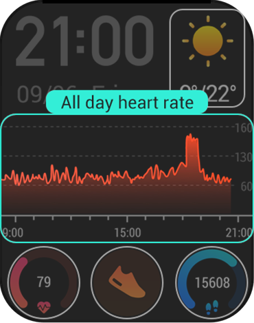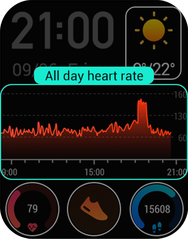 The watch is integrated with Huami's proprietary BioTracker™ PPG biological tracking optical sensor, which can perform constant 24-hour high-precision heart-rate monitoring as well as a heart-rate interval monitoring during workouts, and warning if a much too high value is detected.