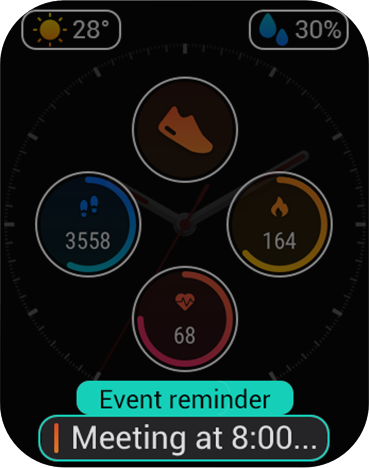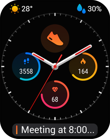 The key information is displayed centrally, focusing on what matters most to you. Except for the time in the upper left corner, there are five display content modules (widgets) that can be customized. In the middle area, you may have weather, heart rate or reminder displayed; in the lower areas, you may switch to stopwatch, alarm clock, battery indicator, or any other of the available 16 options.